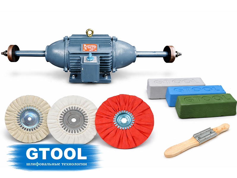 Профессиональный шлифовально-полировальный станок GTOOL с двумя валами для шлифовальных, зачистных и полировальных работ. На валы устанавливаются различные виды кругов (абразивные, полировальные, лепестковые, щёточные). Прямой привод на оба вала от одного двигателя. В процессе работы обрабатываемая деталь удерживается вручную. Исполнение станка в соответствии с нормами безопасности СЕ.
